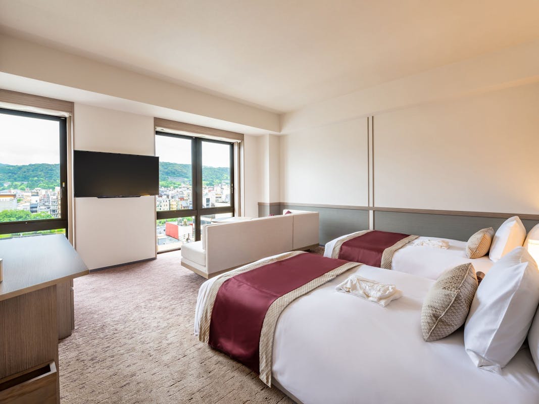 ホテルは南北方向に細長い建物で、東側が東山、鴨川の方向となります。フロントや、朝食会場がある最上階は、東側。八坂神社や清水寺なんかがある東山エリアを一望することができます。京都は建物の高さに規制がある京都ならではの開けた景色が堪能できるでしょう。